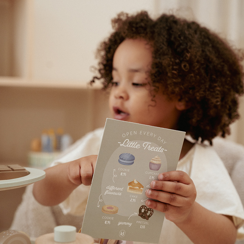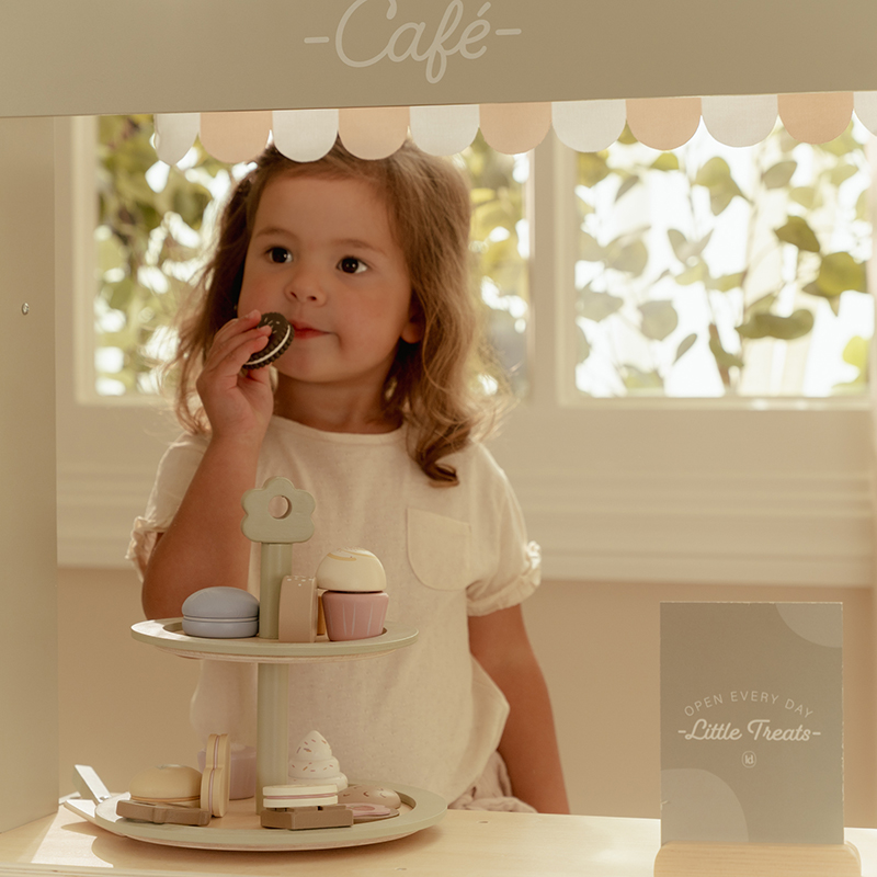 Theetijd! Met deze prachtige houten etagère vol heerlijke gebakjes kunnen kinderen de mooiste high tea serveren. Op de drie lagen vind je een muffin, koekjes en kleurrijke macarons – allemaal even verleidelijk. Gebruik het bijgeleverde taartschepje en het menukaartje met illustraties om de gasten te laten kiezen. Perfect voor fantasierijk speelplezier en gezellige theemomentjes!