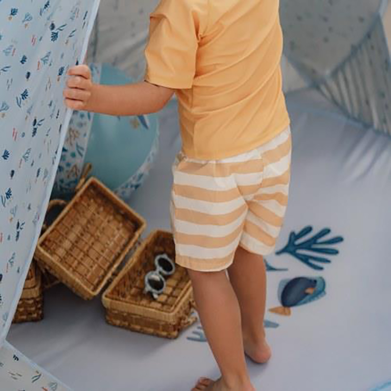 Deze strandtent met illustraties van de collectie Ocean Dreams Blue biedt bescherming tegen de felle zon en een frisse wind. Gebruik de stijlvolle speeltent op het strand, in de tuin of bij een picknick in het park. De pop-up tent voor kinderen is eenvoudig op te zetten en weer op te bergen in de opberghoes.